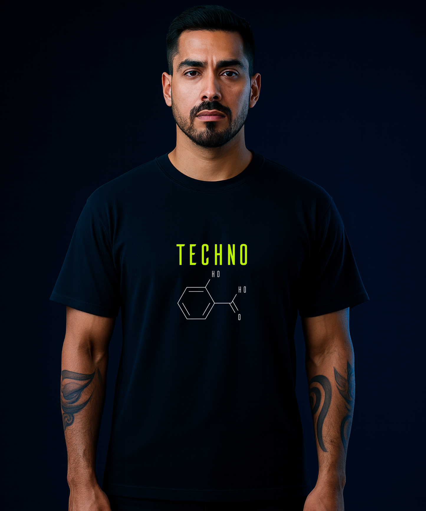 Made from premium cotton, this shirt combines comfort, durability, and a minimalist underground design. The exclusive front print features the word “TECHNO” with a chemical molecule structure a bold symbol of electronic music culture and the rave lifestyle.