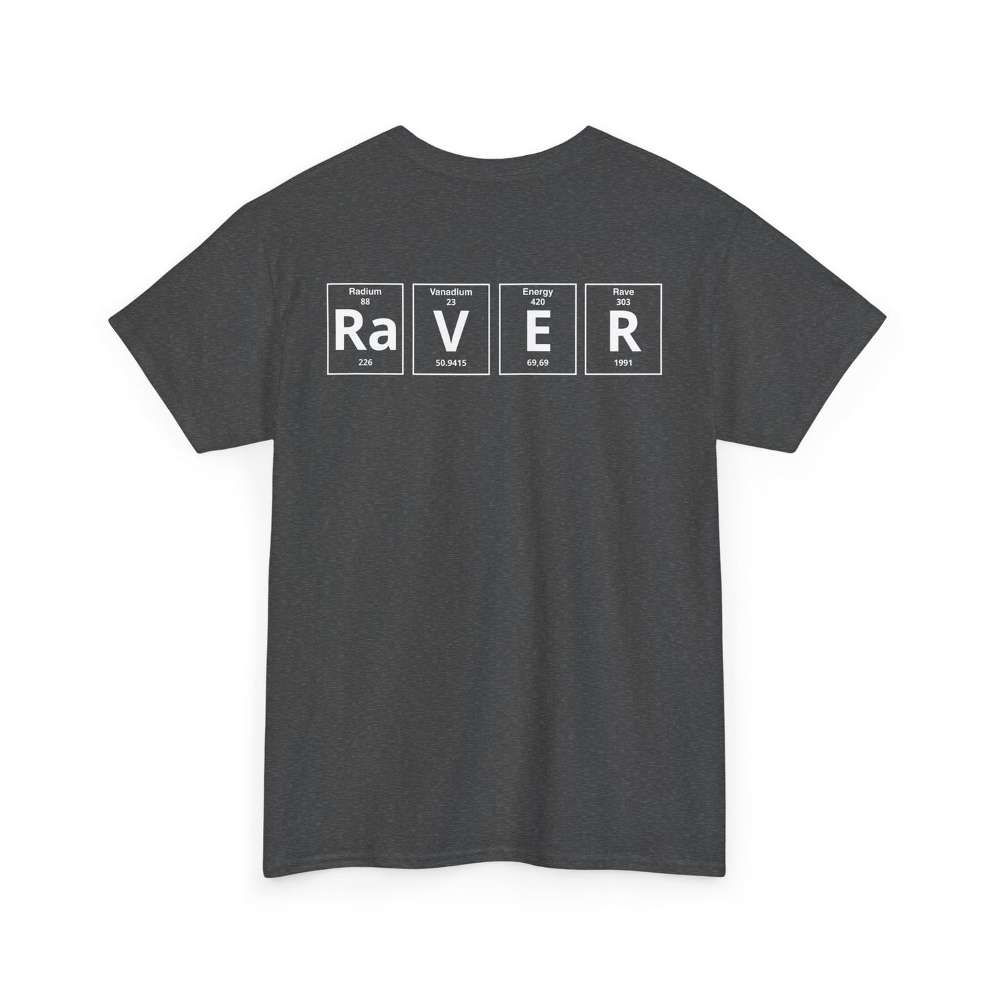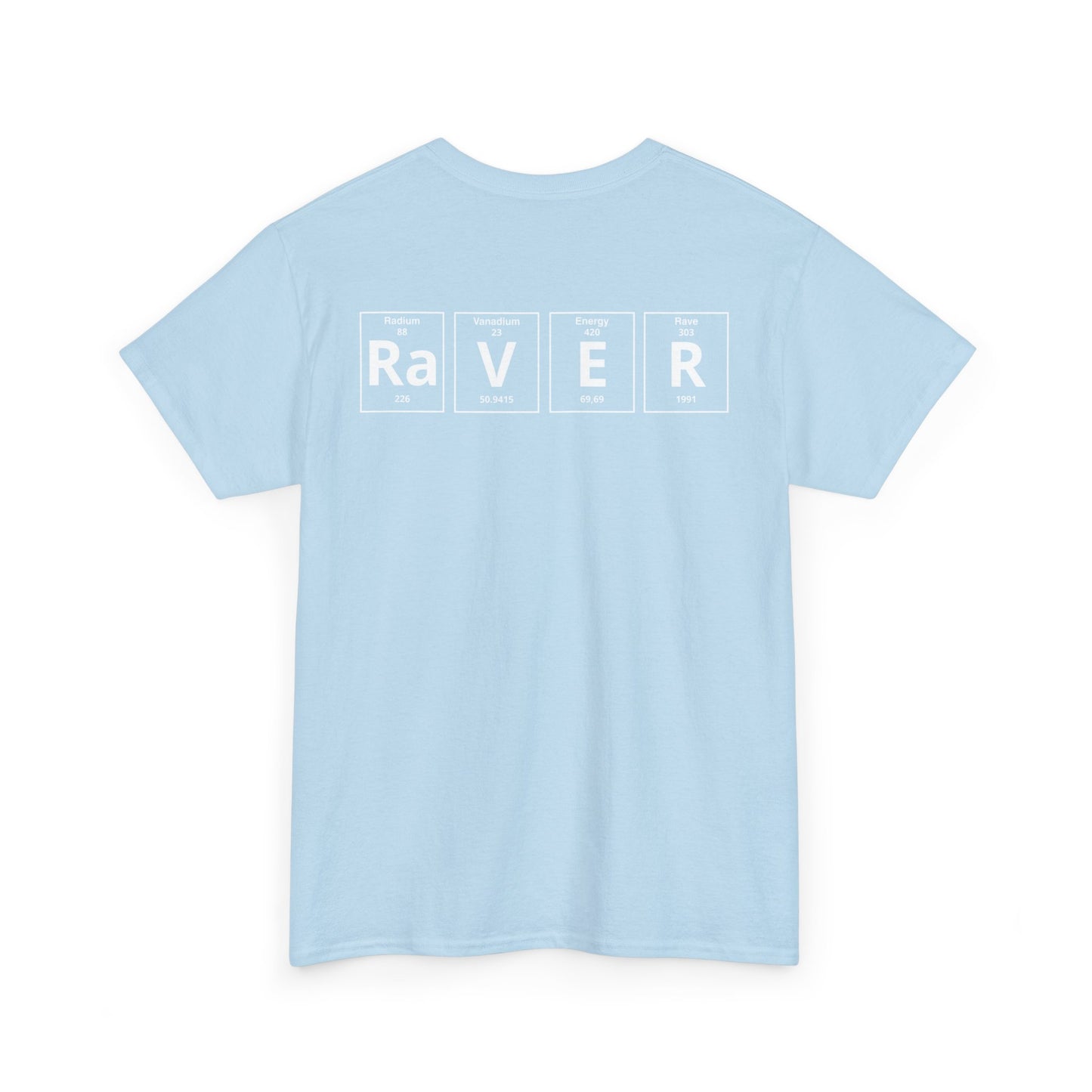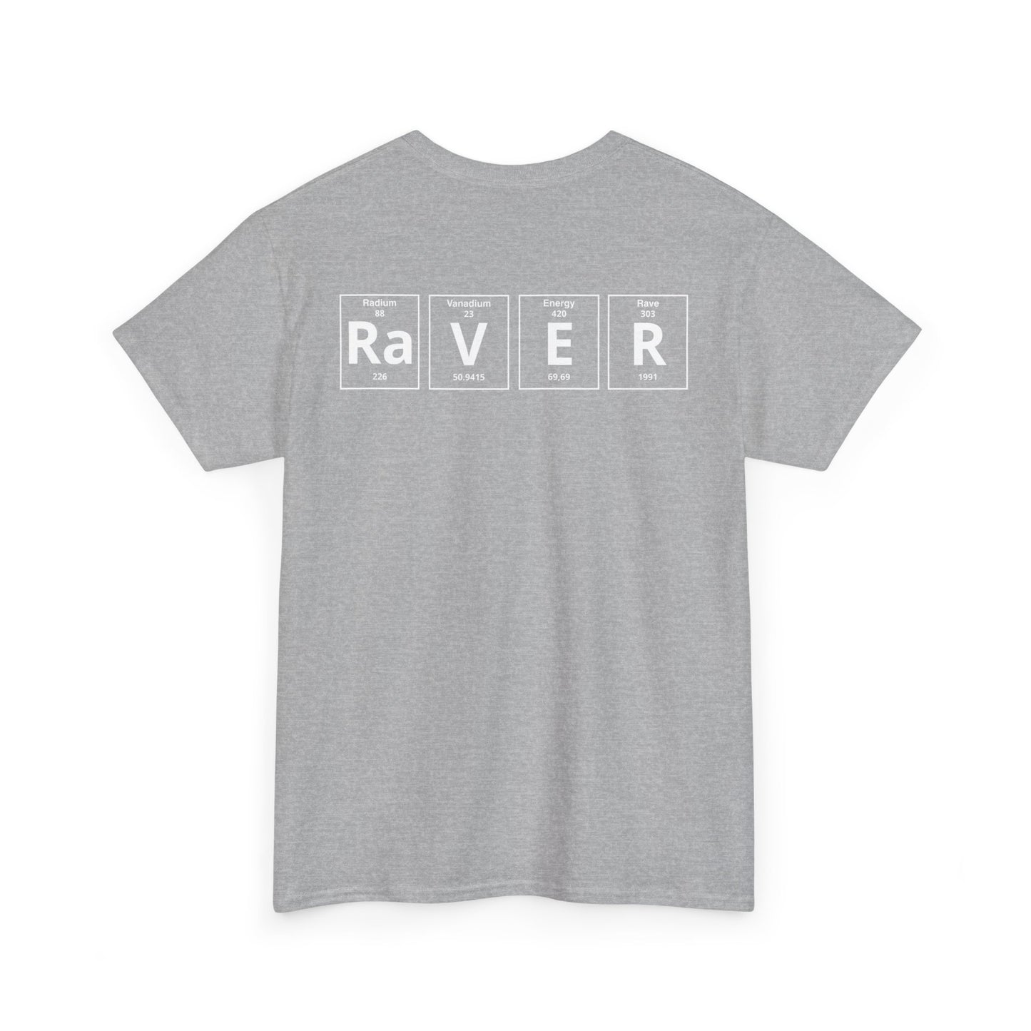 The standout design features the word “RAVER” in periodic table style, combining science with rave culture, a bold and creative way to show your passion for electronic music. Lightweight and versatile, it pairs easily with jeans, shorts, or layered streetwear looks, making it a must-have piece of techno and EDM fashion.