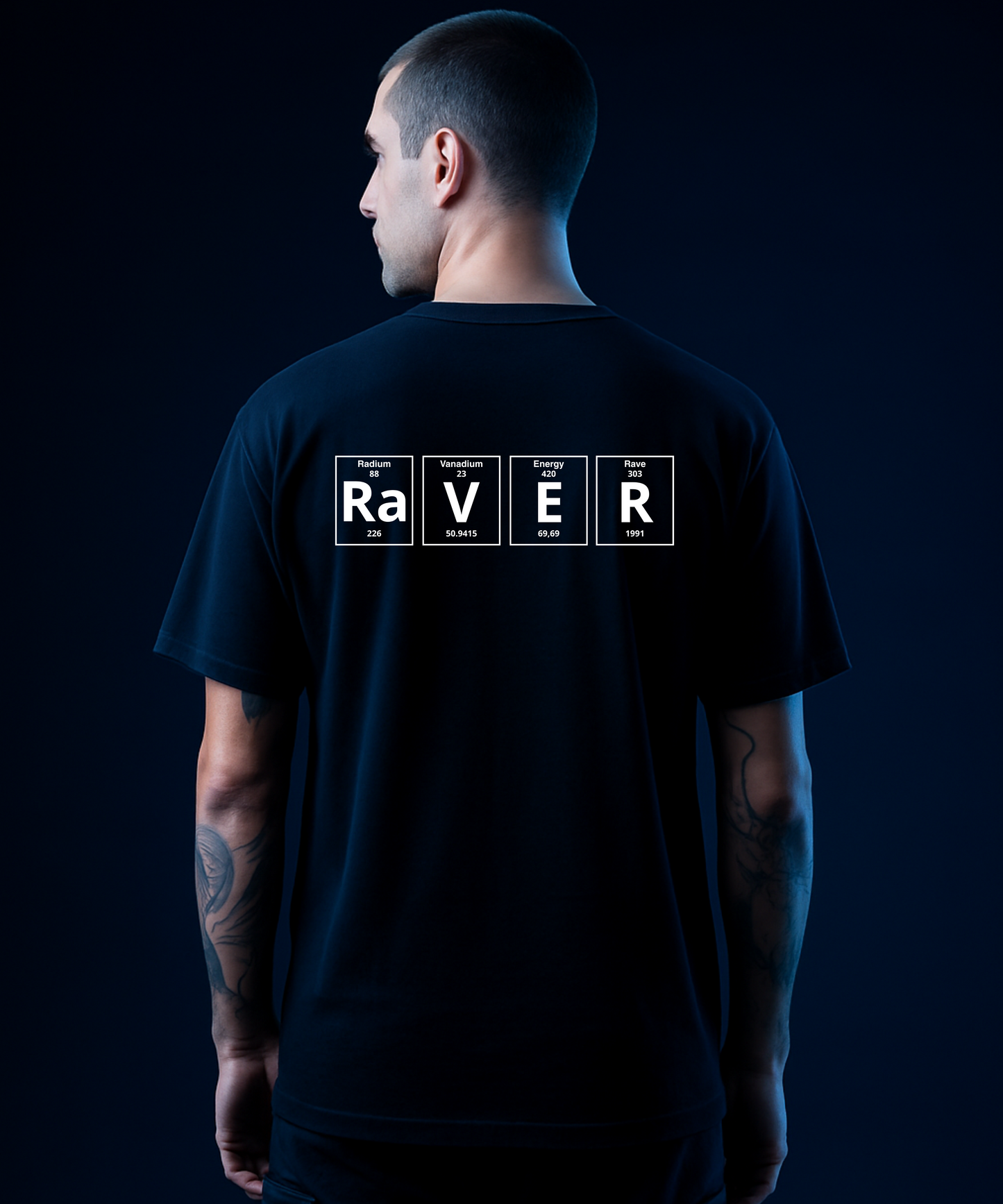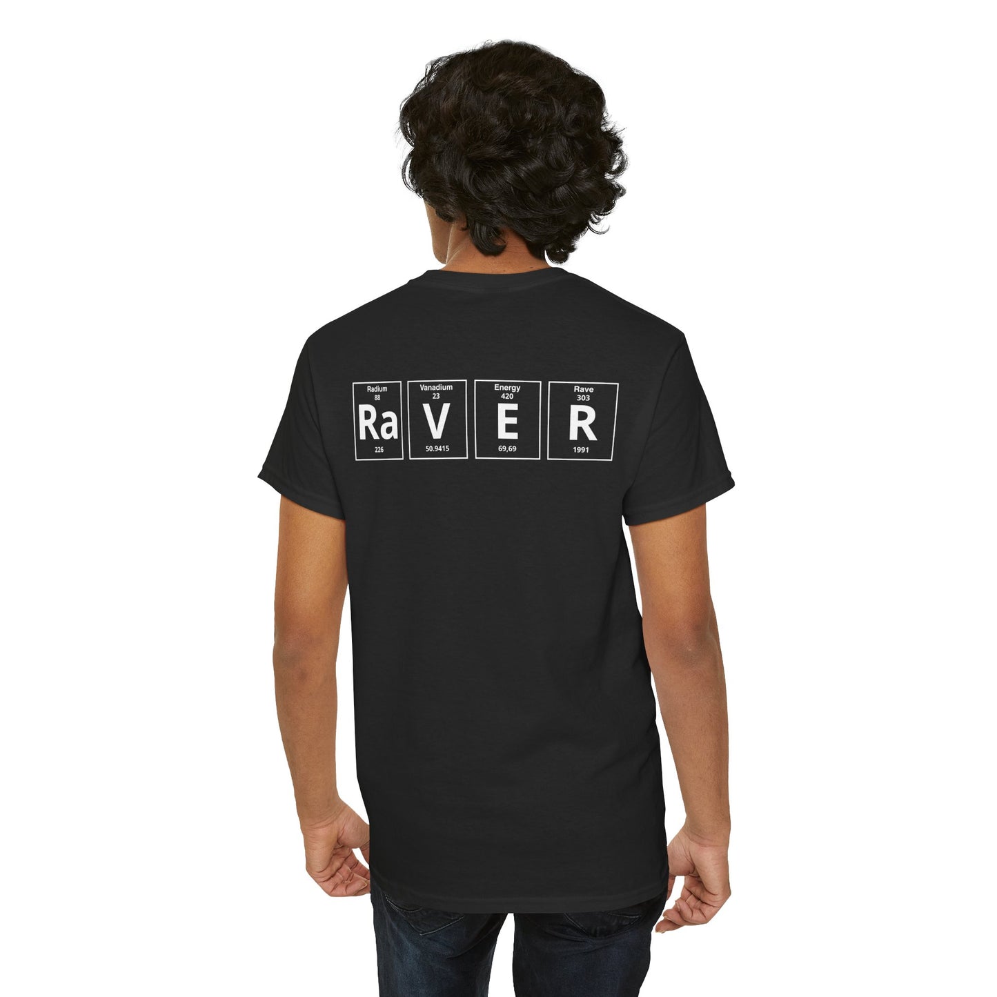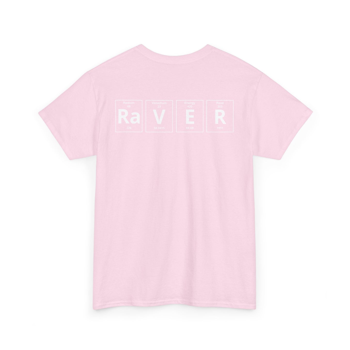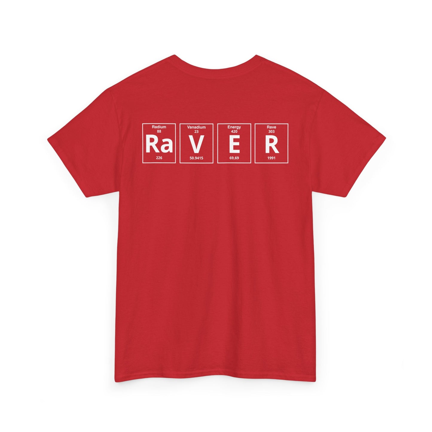 The standout design features the word “RAVER” in periodic table style, combining science with rave culture, a bold and creative way to show your passion for electronic music. Lightweight and versatile, it pairs easily with jeans, shorts, or layered streetwear looks, making it a must-have piece of techno and EDM fashion.